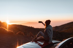 Young woman photographing with phone beautiful landscape during a sunset, sitting on the car hood while traveling high in the mountains