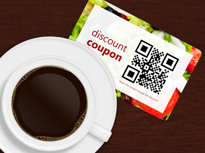 cup of coffee with discount coupon lying on wooden desk. photo of food is author’s property. qr code is designed and generated by author.